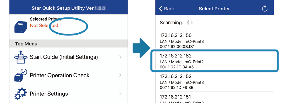 • 執行 Star Quick Setup Utility 選擇連線的印表機。