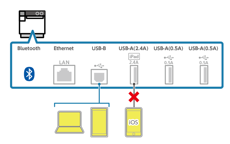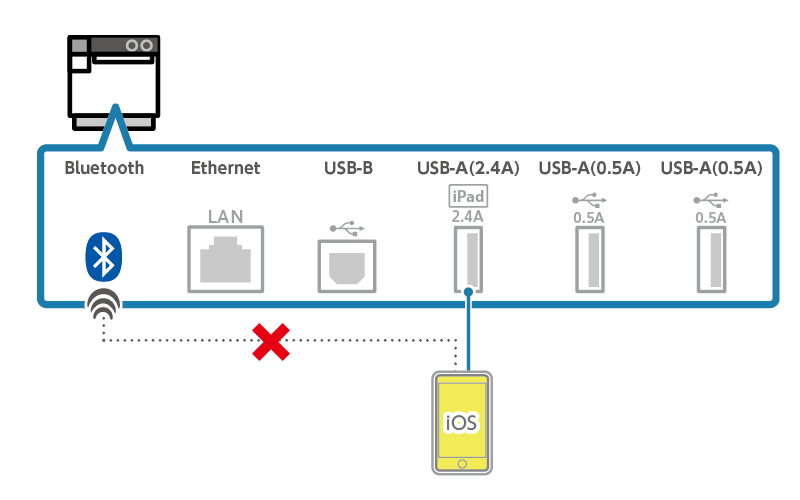 當 iOS 裝置經由藍芽連接到印表機後,如果再連接 USB-A埠 ( 2.4 A ) 時,印表機為了建立與 iOS 裝置通信與充電的連接,會中斷與藍芽的連線。