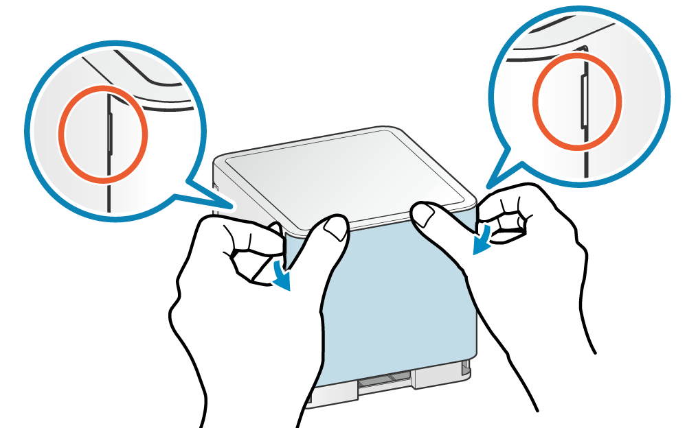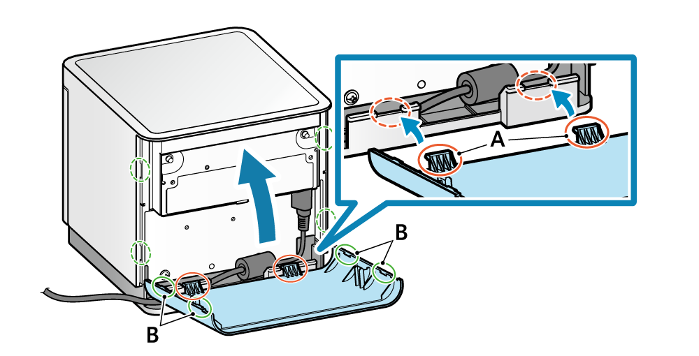 將後蓋底部的掛鉤A放入主機對應的凹槽部分,並蓋上後蓋,直到後蓋左右兩側的掛鉤B卡扣牢固地卡入主機。