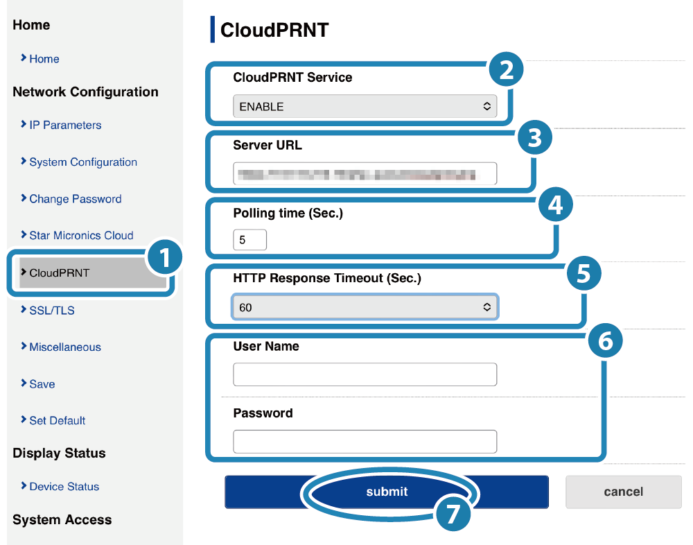 ( 除非 CloudPRNT 伺服器有此要求,否則無需輸入。) - 點擊 [Submit] 按鍵