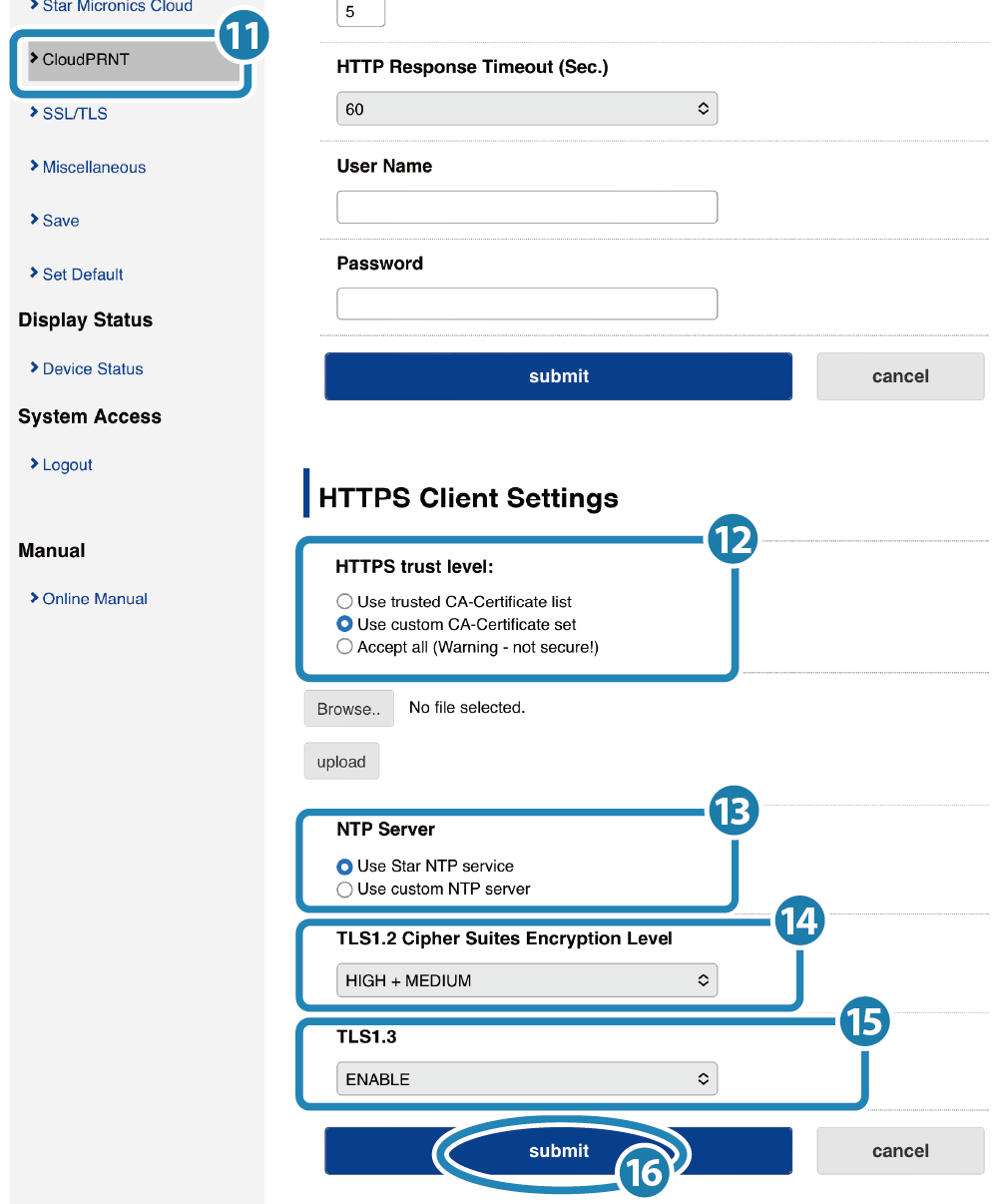 ,點選 “Use custom NTP server” 並輸入使用的 NTP 伺服器網址。 - 根據您的 CloudPRNT 伺服器的支援條件,可指定密碼套件加密級別 ( 印表機的密碼套件加密級別 )
