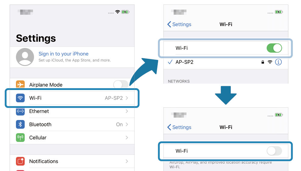 - 請在 iOS 裝置上,從 [Settings]-[Wi-Fi] 選項中,設定 iOS 裝置的 Wi-Fi 為 "OFF"。