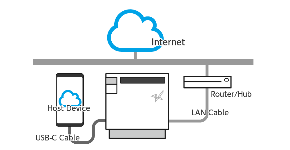 透過使用 USB 訊號線將 PC 或 平板電腦平板電腦 或 智慧手機 iPhone 或 iPad 等有支援 USB PD ( USB Power Delivery ) 之類的主機裝置,連接到一台已經連接到網路的 mC-Print3 印表機後,此時主機裝置不須經由 Wi-Fi,就可以連接到網際網路。