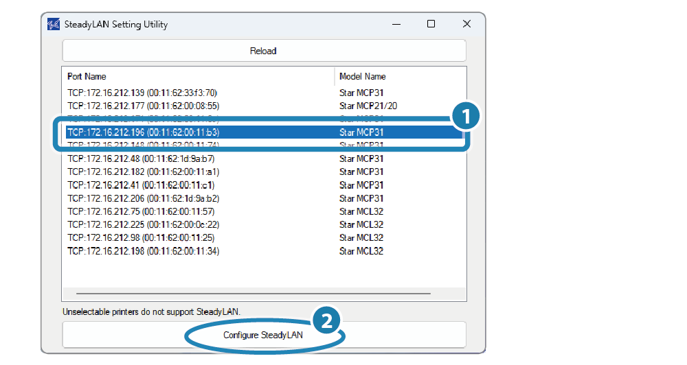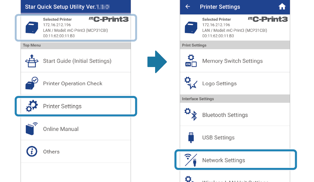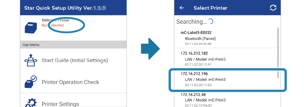 下載並安裝 Star Quick Setup Utility。 使用 App - 執行 Star Quick Setup Utility 選擇連線的印表機。