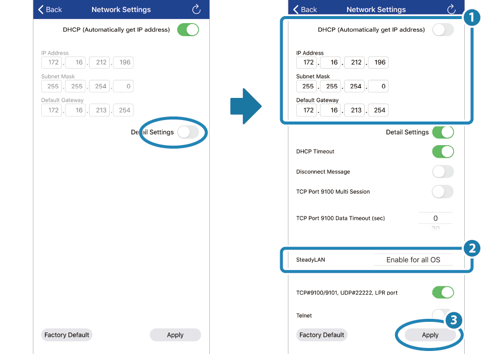 開啟 [Printer Settings] - [Network Settings]。 - 開啟顯示 Detail Settings , 設定網路選項 ( 設定靜態 IP 地址 )