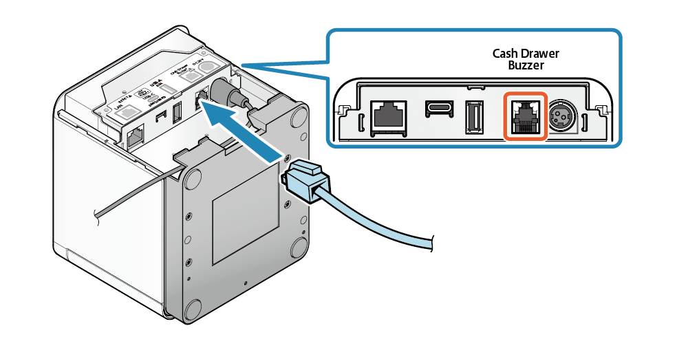 您可將另外販售的旋律揚聲器、蜂鳴器或錢箱等設備,連接到印表機的外部設備驅動連接埠,搭配印表機使用。