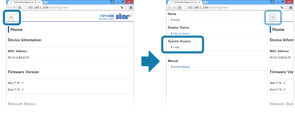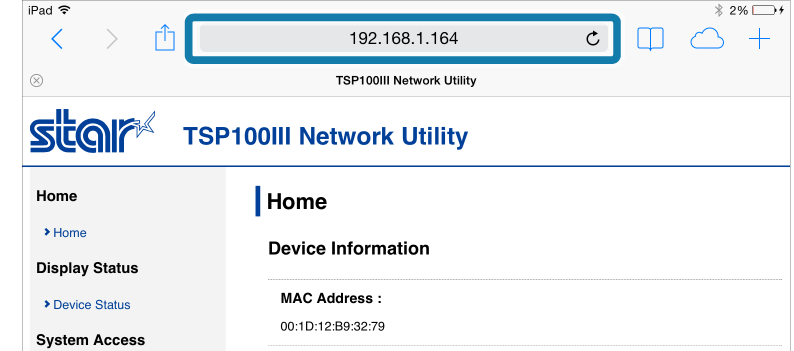 - 在網頁瀏覽器 (例如:Safari 或 其他瀏覽器) 的網址欄位中,輸入上述您已確認的印表機 IP 位址 (例如:192.168.1.164)。這將會開啟指定印表機的網頁設定畫面 (Web 設置功能)。