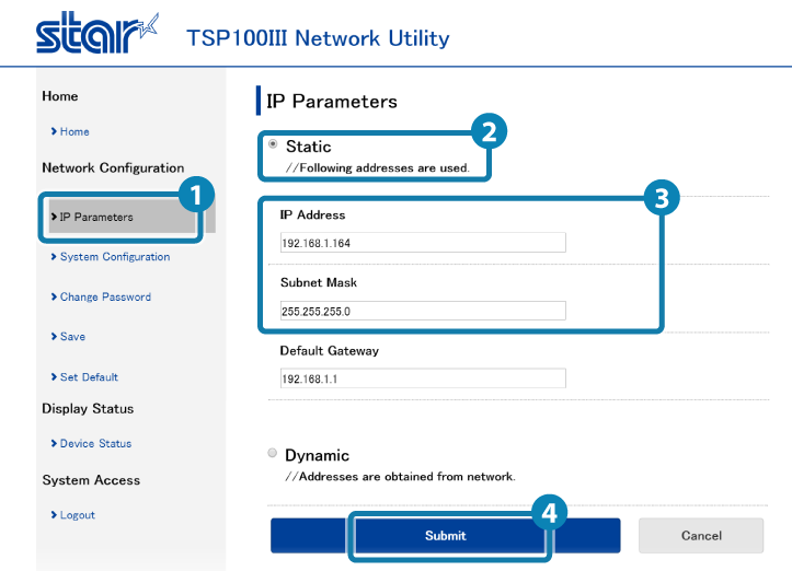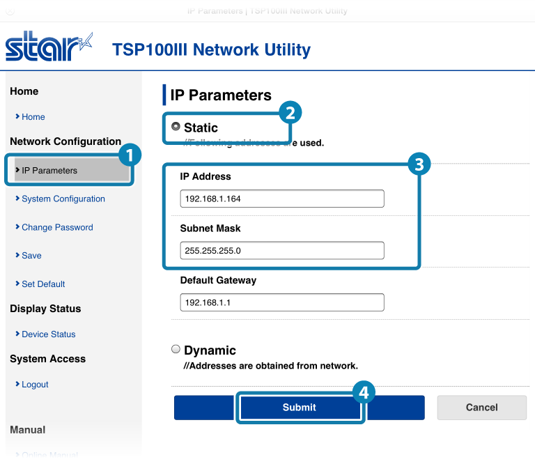 3. 從網頁設定畫面中設定印表機的靜態 IP 地址
