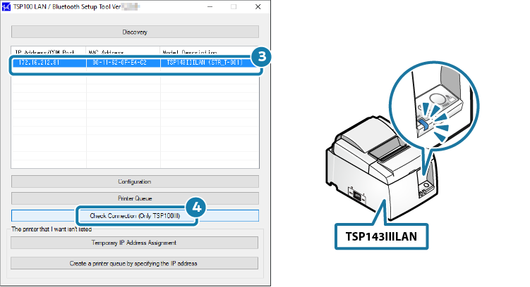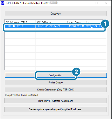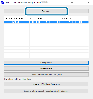 - 點擊設定畫面中的 [搜尋(Discovery)] 按鈕後,可連接的 TSP100LAN/W/BI 系列印表機,會顯示於印表機清單中。