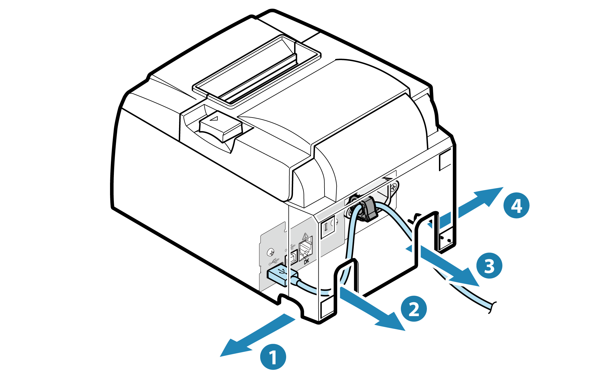 - 印表機有 4 個訊號線出入口(右、左、後),可根據印表機擺設位置選擇走線路徑。