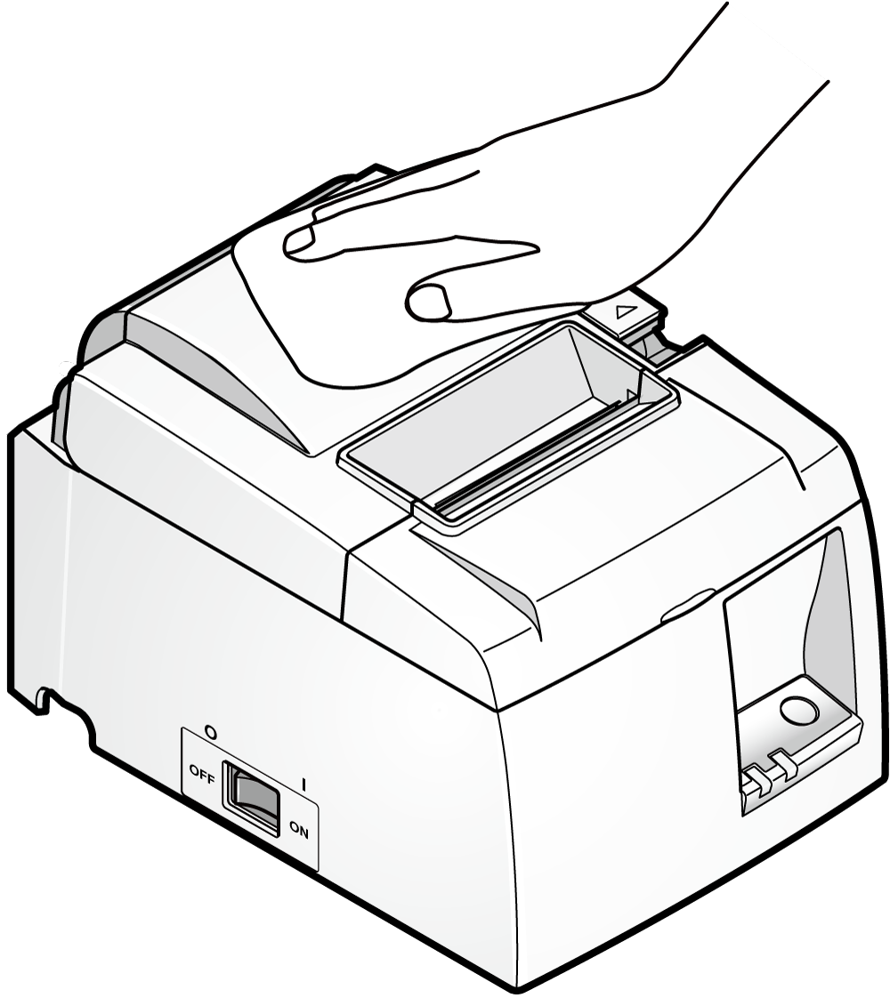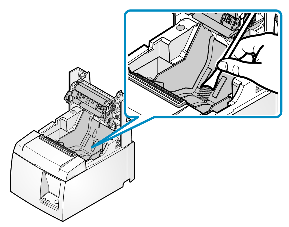 - 清潔可能累積在紙捲置放槽及週邊區域的碎片、灰塵、紙張粉末微粒、膠水等。