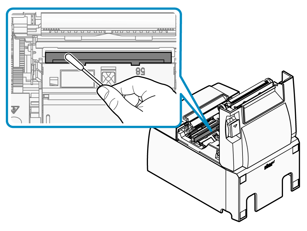 - 用棉花棒蘸酒精(乙醇、甲醇,或異丙醇),將印字頭加熱區擦拭乾淨。