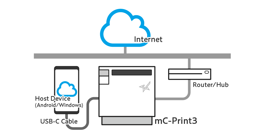 將 平板電腦,智慧手機,或是其他支援 USB PD ( USB Power Delivery *1 ) 裝置,經由 USB-C 訊號線連接到一台已經連接上網的 mC-Print3 印表機後,這些裝置可以不須經由 Wi-Fi,就可以連接到網際網路。