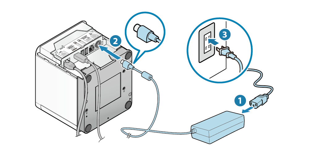 • 將電源線連接到 AC 電源供應器 ,再將 AC 電源供應器插頭連接到印表機 。 然後將電源線插頭插入電源插座