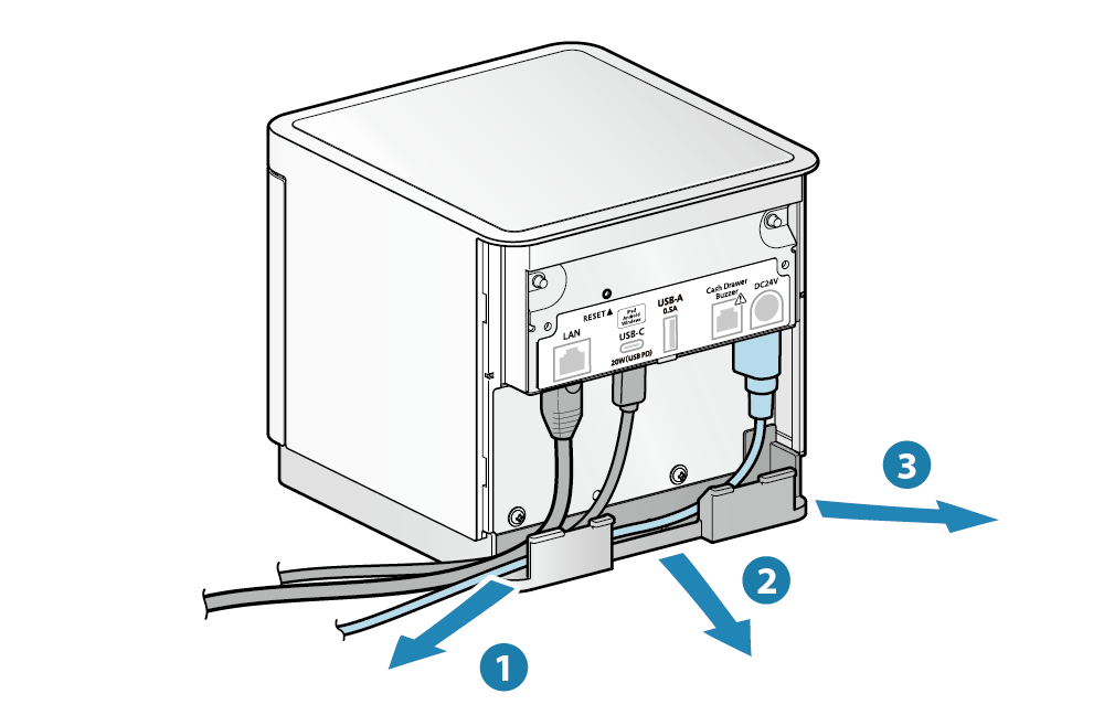 - 電源線出入口有3個位置 ( 右, 左, 後 ),可以依裝置的放置方位配置電源線。