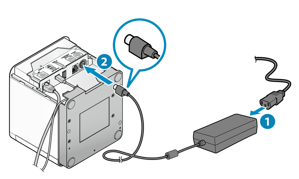 - 請將 AC 電源供應器的插頭,以垂直的方向,正確插入印表機的電源連接座。