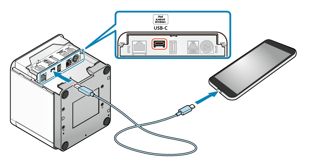 - 將市售或平板,手機隨機提供的 USB ( C-C ) 訊號線,或是 USB ( C-A ) 訊號線,或是 Lightning ( C-Lightning ) 訊號線,連接到印表機的 USB-C 連接埠。