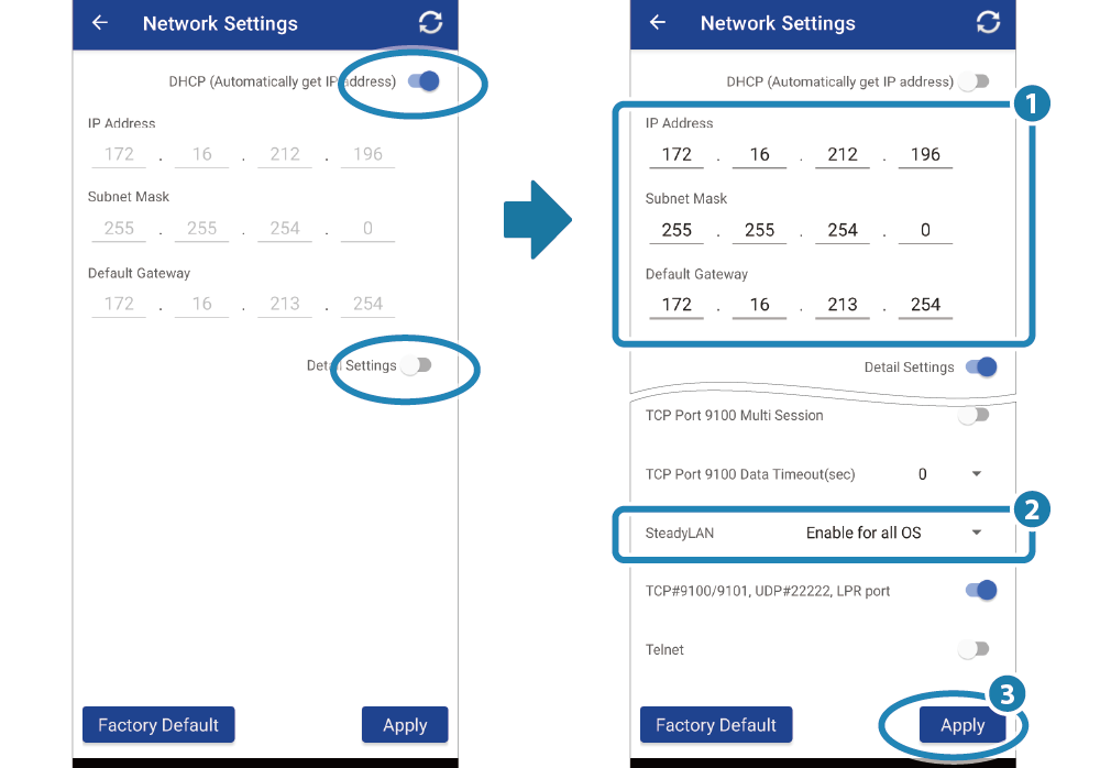 開啟 [Printer Settings] - [Network Settings]。 - 開啟顯示 Detail Settings , 設定網路選項 ( 設定靜態 IP 地址 )