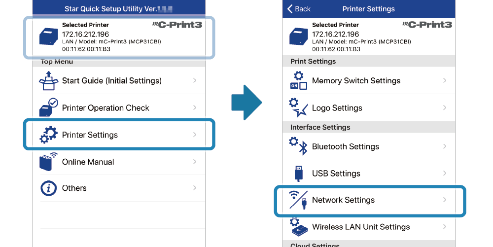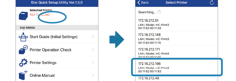 下載並安裝 Star Quick Setup Utility。 使用 App - 執行 Star Quick Setup Utility 選擇連線的印表機。