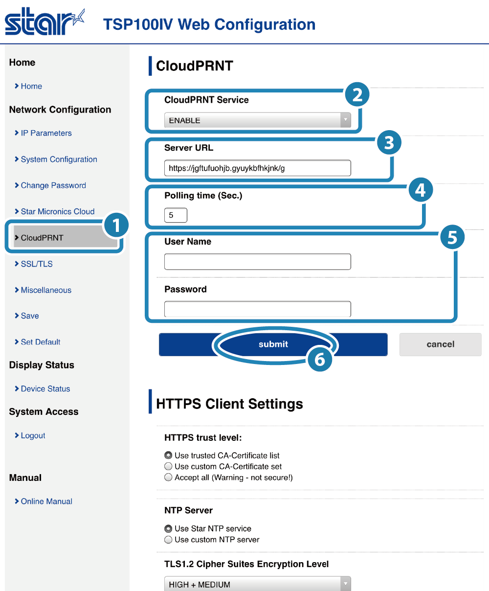 改成 “ENABLE”. - 輸入 CloudPRNT 伺服器的網址於 Server URL 欄位中