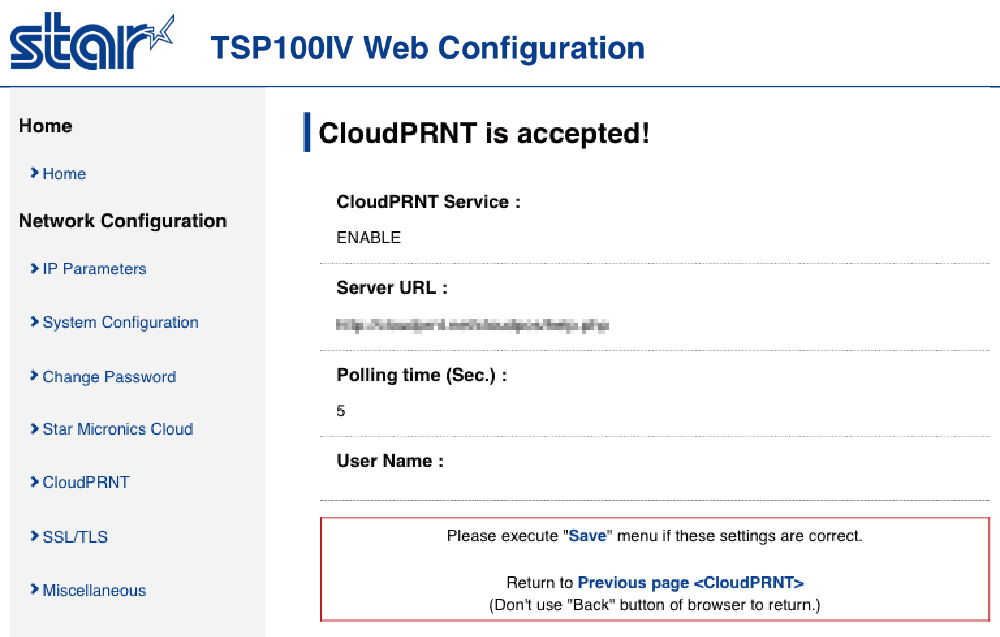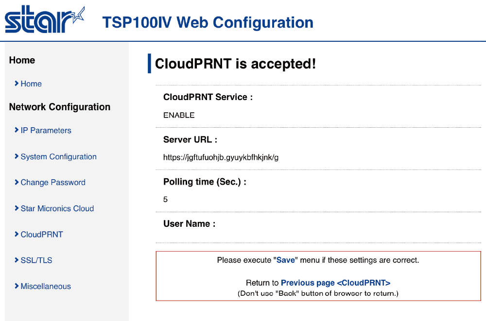 如果 Star CloudPRNT 伺服器,未使用 HTTPS 時,設定步驟到此即完成。