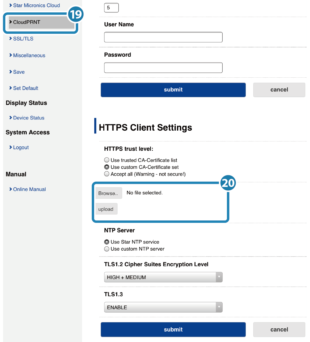 ,點選 “Use custom NTP server” 並輸入使用的 NTP 伺服器網址。 - 根據欲使用之 CloudPRNT 服務器的支援條件,指定 TLS1.2 密碼套件中的加密等級(印表機的密碼套件加密等級)。