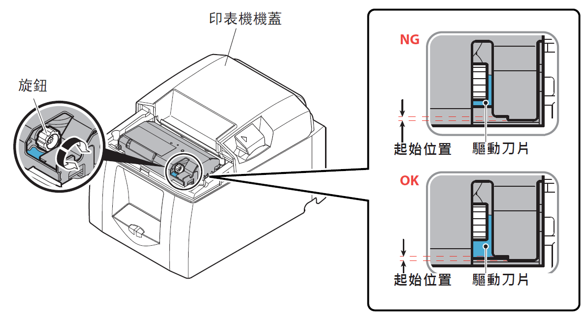 如果裁刀鎖住時,請關閉電源開關再重新開啟,重新啟動印表機時,將恢復解除裁刀鎖住。